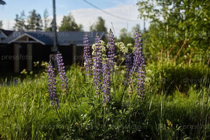 Потрясающие и красивые фиолетовые люпины, цветущие на ярком, пышном зеленом ландшафте