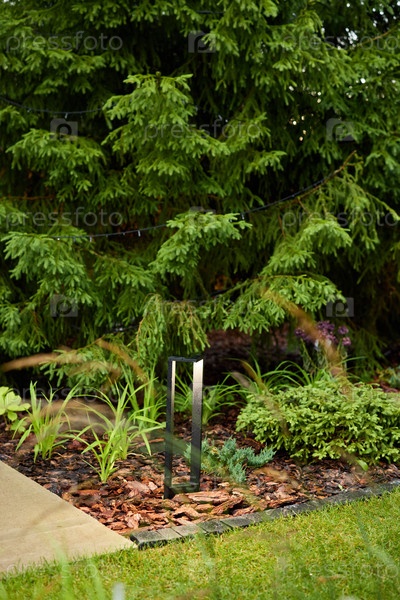 Красивый пышный сад с декоративным освещением и разнообразными сезонными растениями