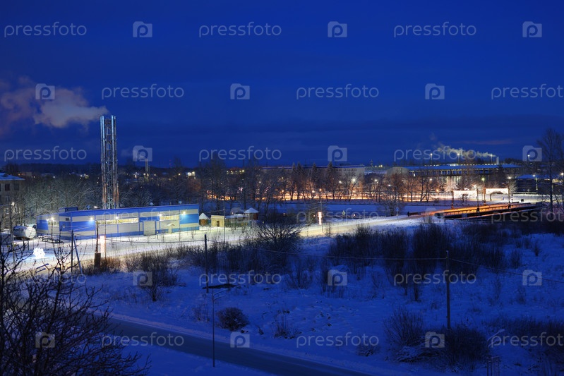 Спокойная зимняя ночная сцена с оживленной промышленной деятельностью на фоне спокойного снежного пейзажа