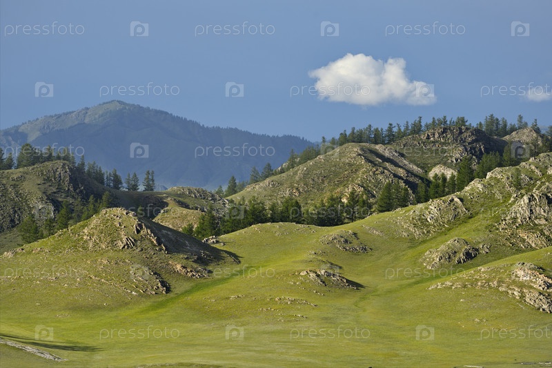 Россия. Юг Западной Сибири, Горный Алтай. Живописные священные горы, покрытые сплошным зеленым ковром со множеством альпийских цветов, близ села Усть-Кан