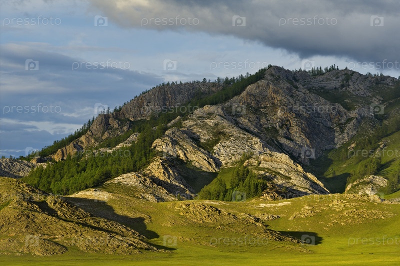 Россия. Юг Западной Сибири, Горный Алтай. Живописные священные горы, покрытые сплошным зеленым ковром со множеством альпийских цветов, близ села Усть-Кан