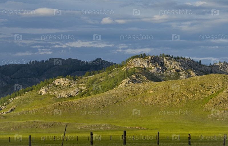 Россия. Юг Западной Сибири, Горный Алтай. Живописные священные горы, покрытые сплошным зеленым ковром со множеством альпийских цветов, близ села Усть-Кан