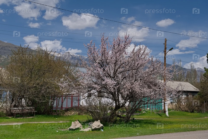 Кыргызстан, Иссык-Кульская область. 23 апреля 2024 года. Архитектура деревенского дома в окружении весенних садовых деревьев вдоль шоссе вокруг озера Иссык-Куль