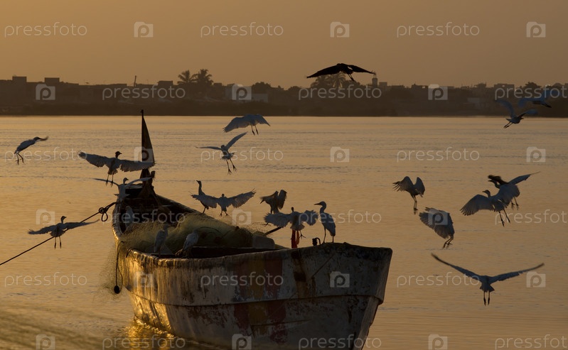 Западная Африка. Сенегал. Стая белых городских цапель на баркасе в морском порту Сент-Луиса в лучах утреннего солнца