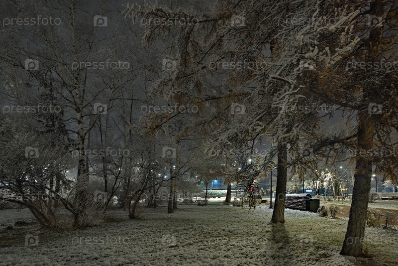 Новокузнецк, Россия. 01 ноября 2024 года. Живописный вид на деревья городского парка, покрытые первым осенним снегом и подсвеченные фонарями холодного света