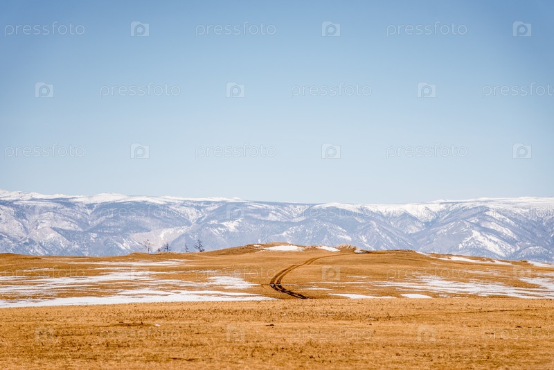Проселочная зимняя дорога среди гор, внедорожная трасса