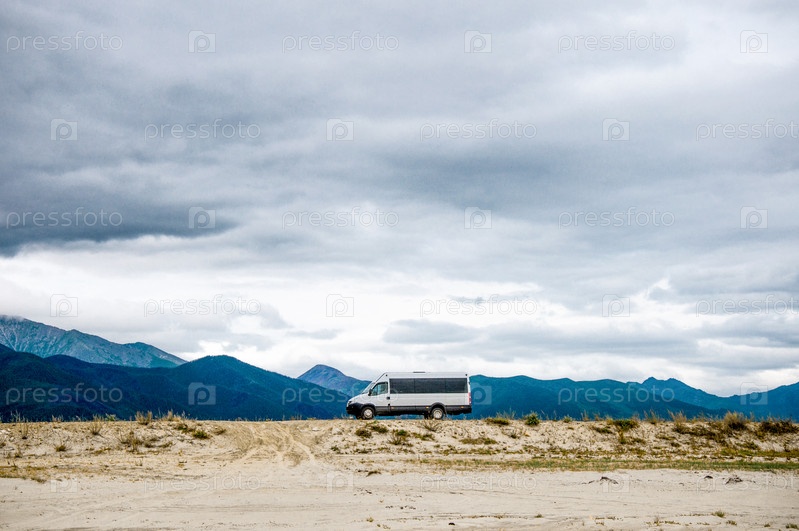 Автомобиль с туристами едет по проселочной дороге среди гор
