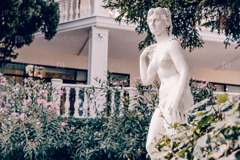 Партенит, Крым, июль 2020, Современная мраморная статуя каменной женщины на заднем плане