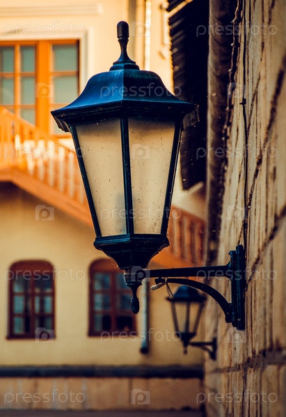 Металлический стеклянный подвесной фонарь, висящий на кирпичной стене старого исторического здания
