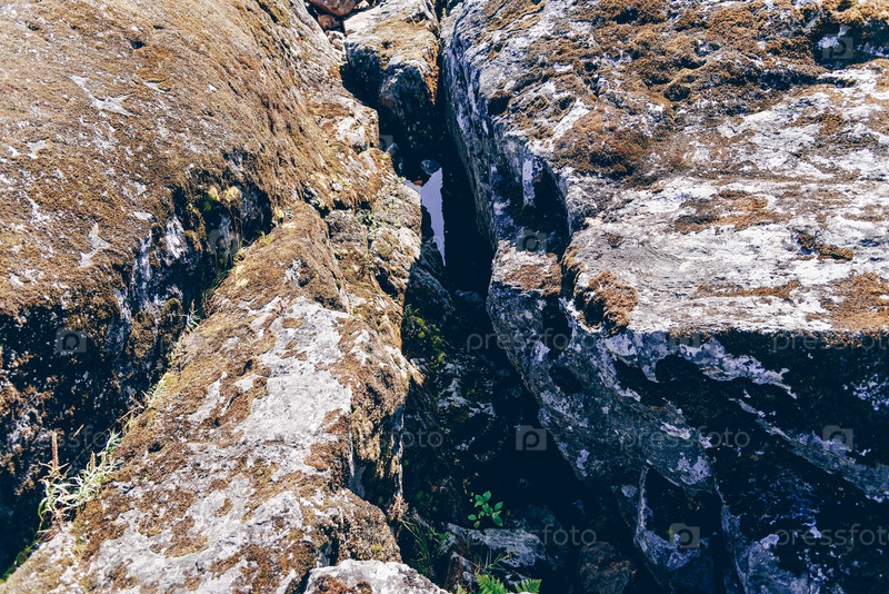 Текстура натурального камня с трещинами, растительностью и грязью, дизайн фона текстуры