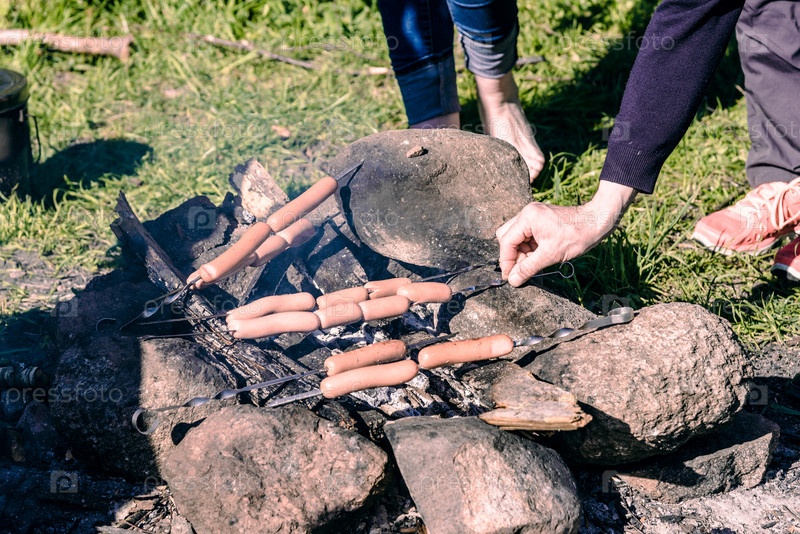 Походная кухня, приготовление пищи в походном лагере в костре, турист ест суп