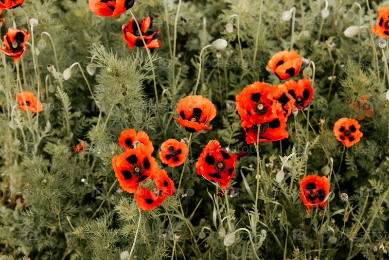 Цветные красные полевые цветы мака, растущие на лугу крупным планом, природный ландшафт