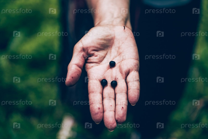 Садовник держит в руке свежие черные лесные ягоды, собранные в лесу