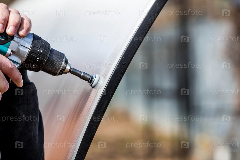 Мужчина держит аккумуляторную отвертку и собирает новую теплицу из полиэтилена, поликарбоната. Макросъемка. Вид сбоку. Подготовка к весеннему садовому сезону