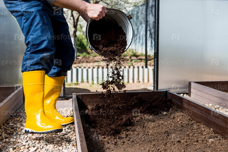 Мужчина-фермер насыпает новую почву, почву для новой теплицы. Концепция весенней посадки овощей, установки теплицы и фермерства