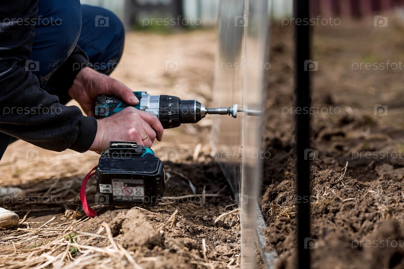 Мужчина держит аккумуляторную отвертку и собирает новую теплицу из полиэтилена, поликарбоната. Макросъемка. Вид сбоку. Подготовка к весеннему садовому сезону