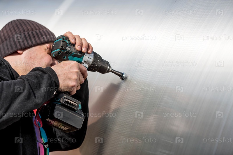 Мужчина держит аккумуляторную отвертку и собирает новую теплицу из полиэтилена, поликарбоната. Макросъемка. Вид сбоку. Подготовка к весеннему садовому сезону