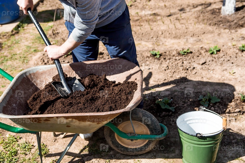Мужчина-фермер насыпает новую почву, почву для новой теплицы. Концепция весенней посадки овощей, установки теплицы и фермерства