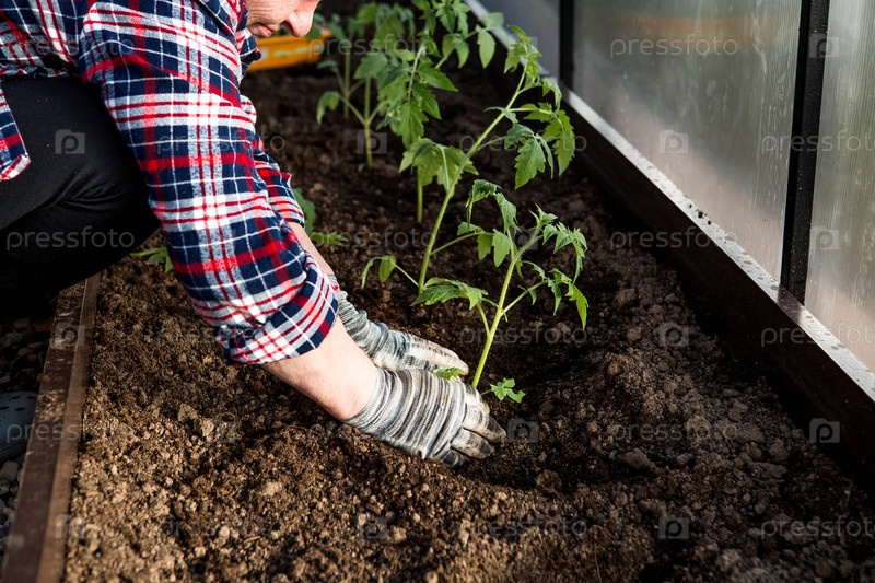 Руки пожилой женщины держат молодое растение в земле. Рассада томатов высаживается в землю. Концепция весенней посадки овощей и сельского хозяйства