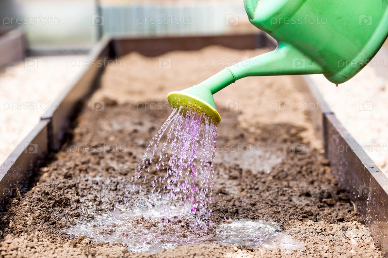 В руках у пожилой женщины лейка. Фермер поливает огород растворами марганцовки от болезней и вредителей перед высадкой рассады в грунт