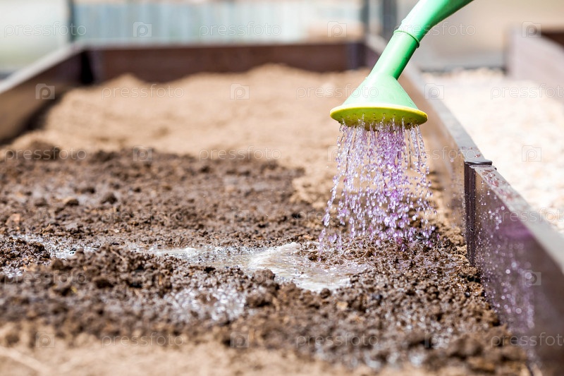 В руках у пожилой женщины лейка. Фермер поливает огород растворами марганцовки от болезней и вредителей перед высадкой рассады в грунт