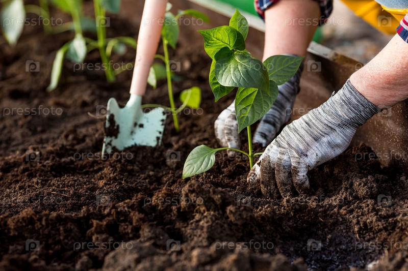 Руки пожилой женщины держат молодое растение в земле. Рассада болгарского перца высаживается в землю. Концепция весенней посадки овощей и сельского хозяйства
