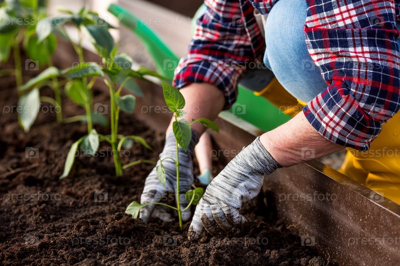 Руки пожилой женщины держат молодое растение в земле. Рассада болгарского перца высаживается в землю. Концепция весенней посадки овощей и сельского хозяйства