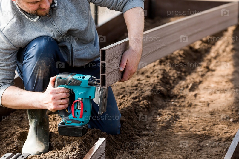 Мужчина держит аккумуляторную электропилу и строит новые грядки в теплице из древесно-полимерного композита. Макросъемка. Вид сбоку. Подготовка к весеннему садовому сезону