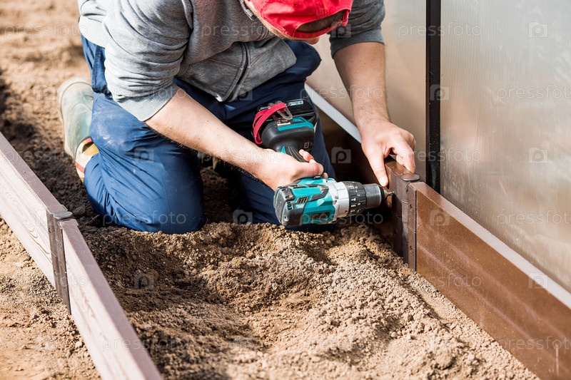 Мужчина держит аккумуляторную отвертку и собирает новые грядки из ДПК в теплицу из полиэтилена, поликарбоната. Макросъемка. Вид сбоку. Подготовка к весеннему садовому сезону