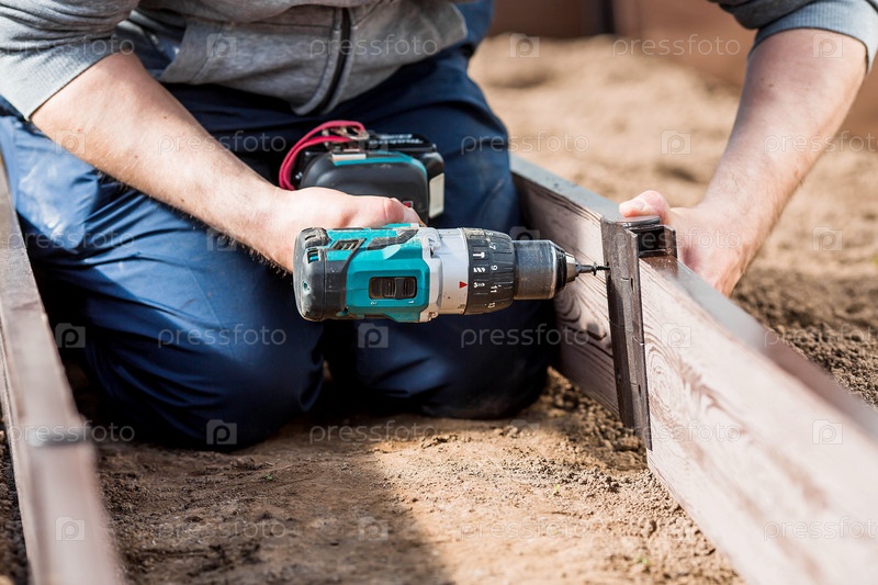 Мужчина держит аккумуляторную отвертку и собирает новые грядки из ДПК в теплицу из полиэтилена, поликарбоната. Макросъемка. Вид сбоку. Подготовка к весеннему садовому сезону