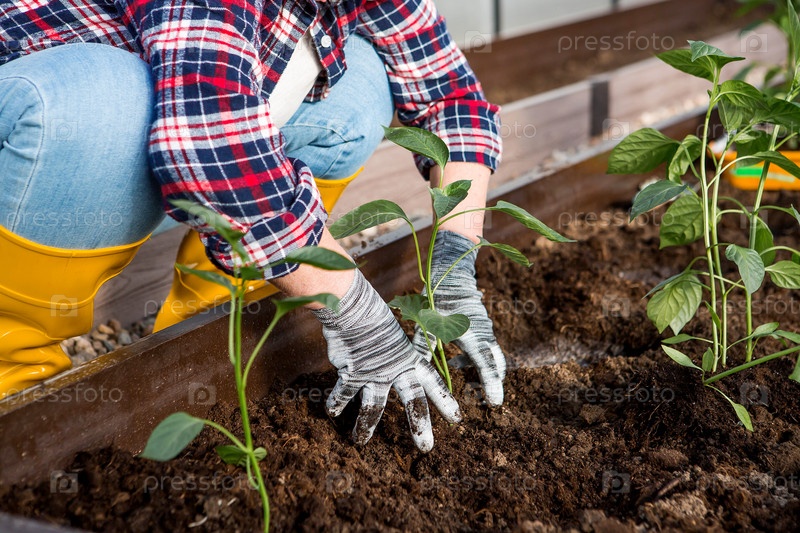 Руки пожилой женщины держат молодое растение в земле. Рассада болгарского перца высаживается в землю. Концепция весенней посадки овощей и сельского хозяйства