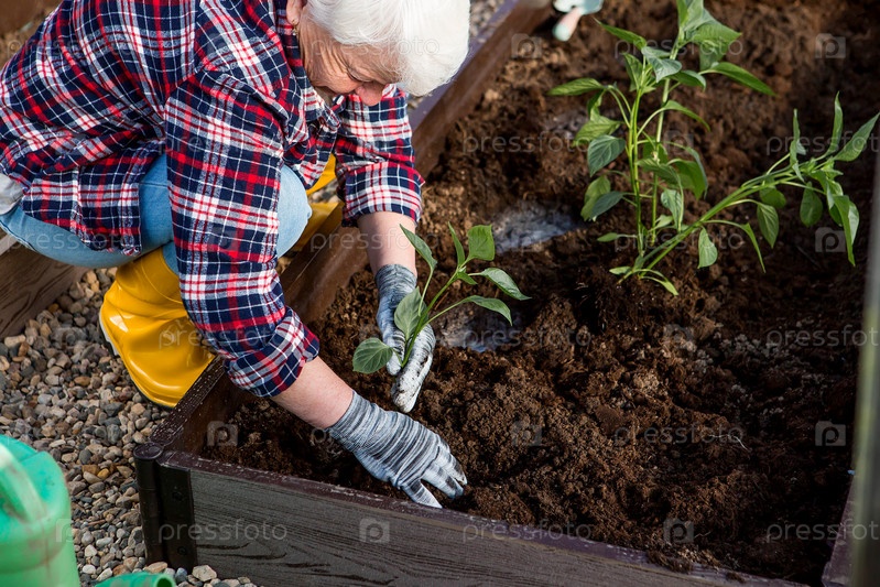 Руки пожилой женщины держат молодое растение в земле. Рассада болгарского перца высаживается в землю. Концепция весенней посадки овощей и сельского хозяйства
