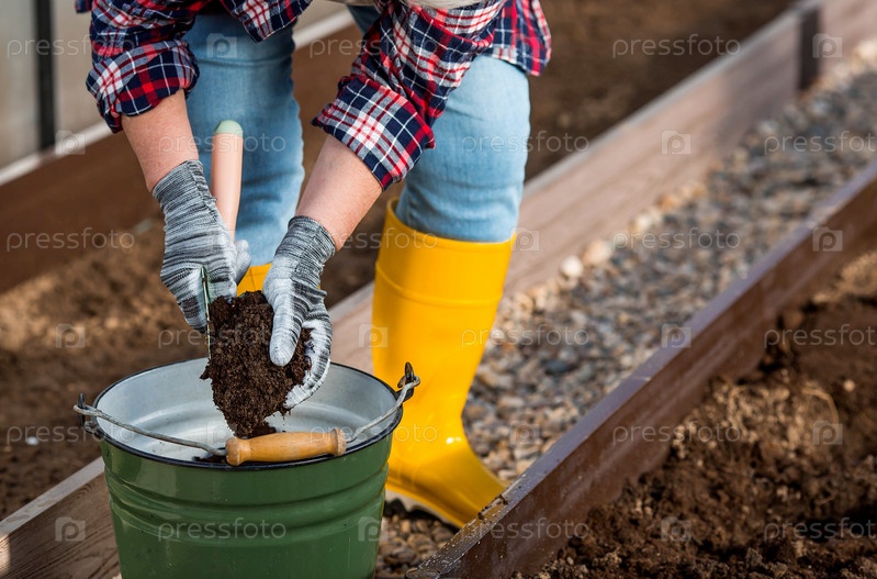 Женщина-фермер насыпает новую почву, почву для новой теплицы. Концепция весенней посадки овощей и земледелия