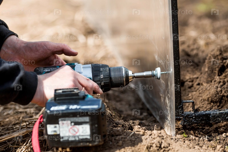 Мужчина держит аккумуляторную отвертку и собирает новую теплицу из полиэтилена, поликарбоната. Макросъемка. Вид сбоку. Подготовка к весеннему садовому сезону