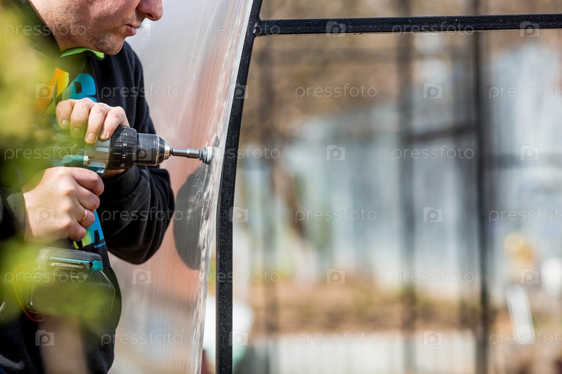 Мужчина держит аккумуляторную отвертку и собирает новую теплицу из полиэтилена, поликарбоната. Макросъемка. Вид сбоку. Подготовка к весеннему садовому сезону