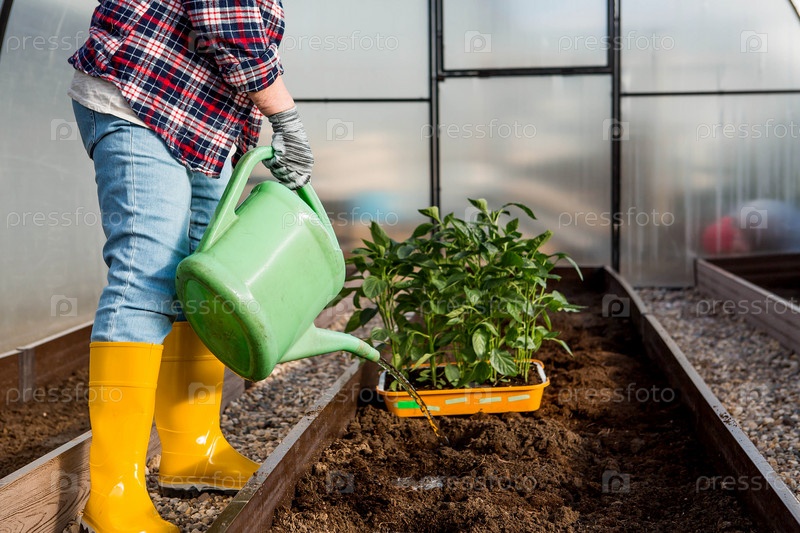 Пожилая женщина-фермер поливает рассаду болгарского перца из лейки. Она высажена в землю. Концепция весенней посадки овощей и сельского хозяйства