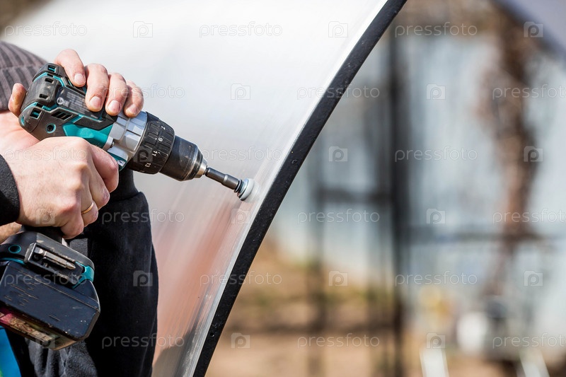 Мужчина держит аккумуляторную отвертку и собирает новую теплицу из полиэтилена, поликарбоната. Макросъемка. Вид сбоку. Подготовка к весеннему садовому сезону