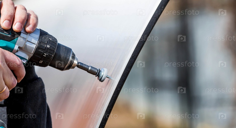 Мужчина держит аккумуляторную отвертку и собирает новую теплицу из полиэтилена, поликарбоната. Макросъемка. Вид сбоку. Подготовка к весеннему садовому сезону