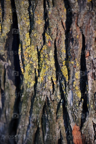Текстурированная поверхность коры деревьев демонстрирует замысловатые узоры лишайников, демонстрируя красоту природы