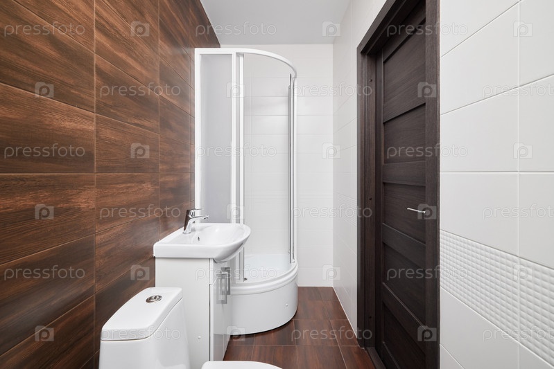 Современный интерьер ванной комнаты со стильной душевой кабиной, окруженной деревянными акцентами