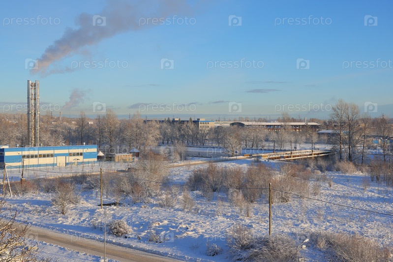 Зимний пейзаж с индустриальным фоном, украшенный мягким снегопадом