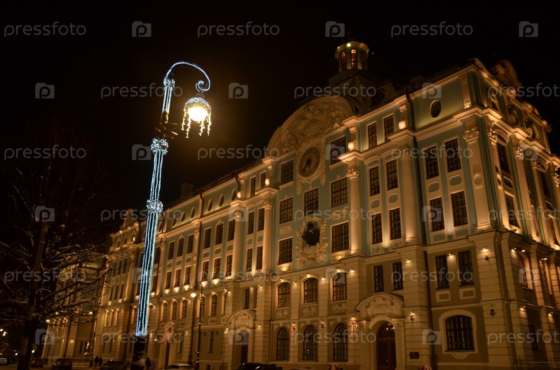 Здание Нахимовского военно-морского училища на Петроградской набережной в Санкт-Петербурге на фоне украшенного к новому году уличного фонаря зимним вечером