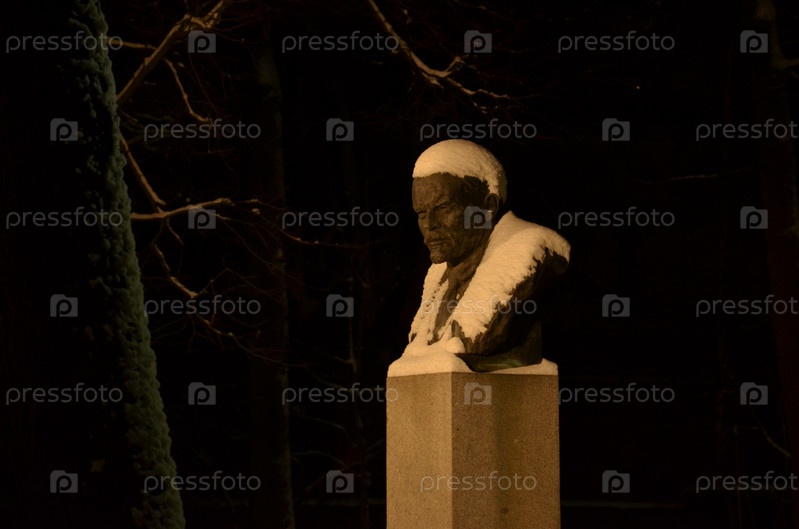 Бюст В.А. Ленина в снегу в саду Александровского лицея на Каменноостровском проспекте в Санкт-Петербурге зимним вечером