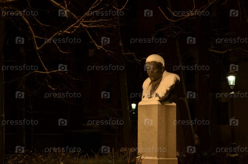 Бюст В.А. Ленина в снегу в саду Александровского лицея на Каменноостровском проспекте в Санкт-Петербурге зимним вечером