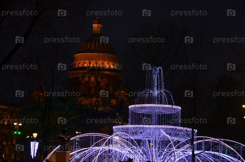 Новогодний светящийся фонтан в Александровском саду в Санкт-Петербурге, на заднем фоне Исаакиевский собор зимним вечером