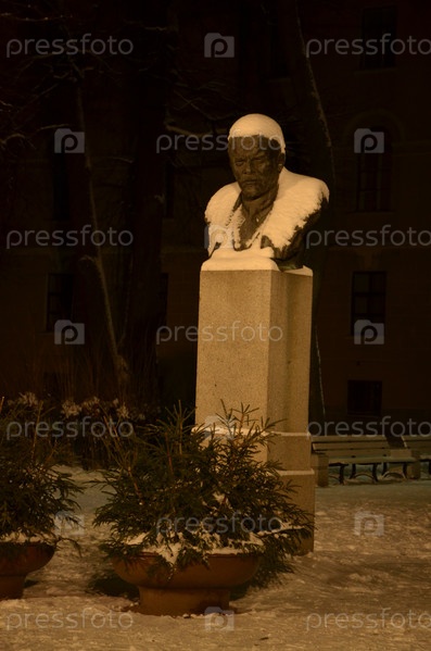 Бюст В.А. Ленина в снегу в саду Александровского лицея на Каменноостровском проспекте в Санкт-Петербурге зимним вечером