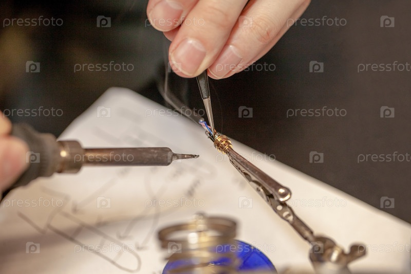 Электрик ремонтирует электрический компонент, на столе с устройством и инструментами, крупный план, размытый фон