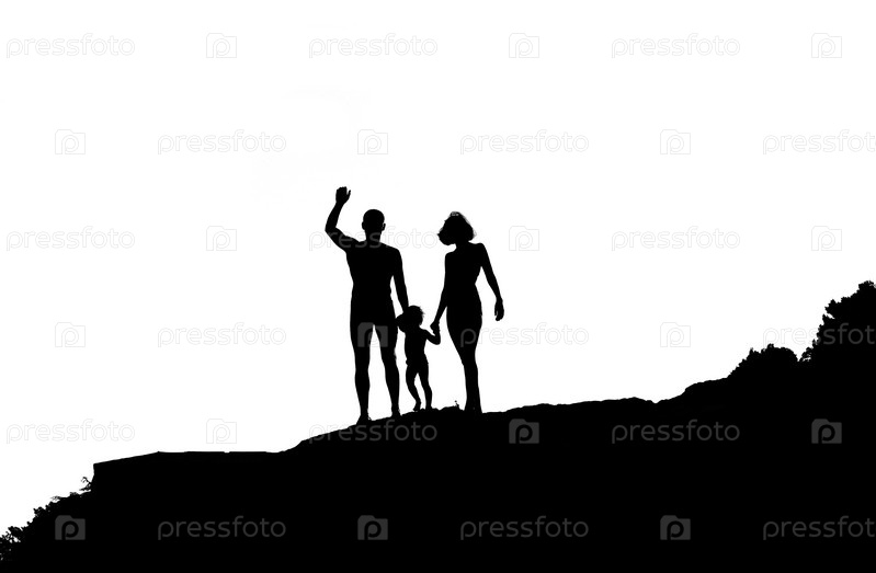 Силуэты из трех человек. Мужчина, ребенок и женщина стоят на холме
