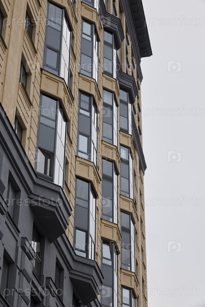 Современный городской фасад здания со стильно оформленными окнами и современными элементами