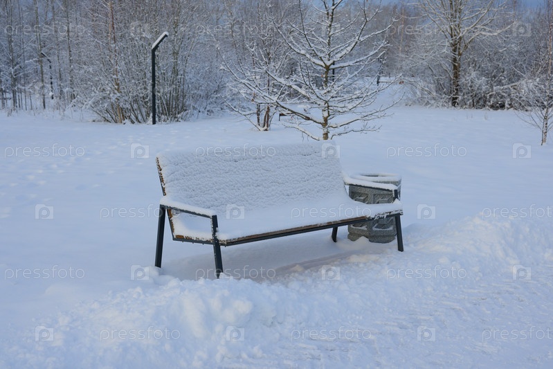 Заснеженная скамейка в парке оливково-зеленого цвета на фоне живописного пейзажа зимней сказки